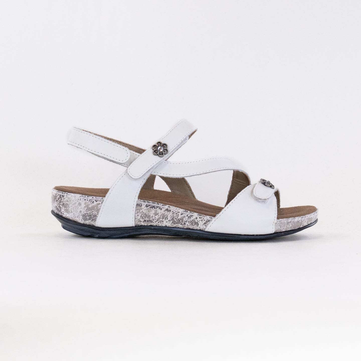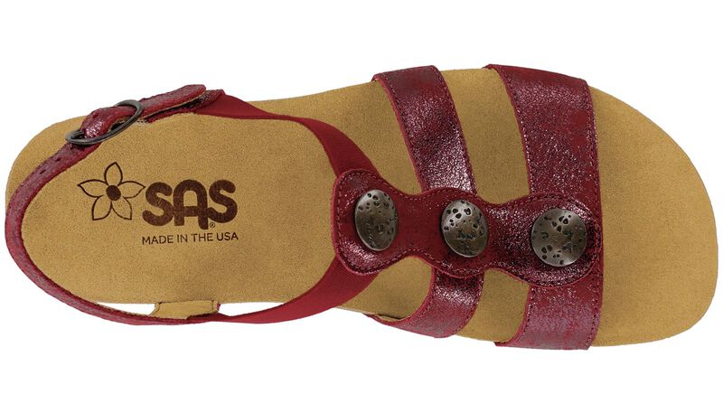 This stylish sandal has the benefits of a supportive ankle strap, and the ease of a slip-on with elastic gore straps across the top of the foot. Premium burnished metal accents adorn a curved leather strap down the front of the foot. Soft leather straps and a hand-polished wood effect on the sole give this sandal unique style. The foot bed molds to the natural arch of the foot, providing extra cushion to the arch and all-day comfort.