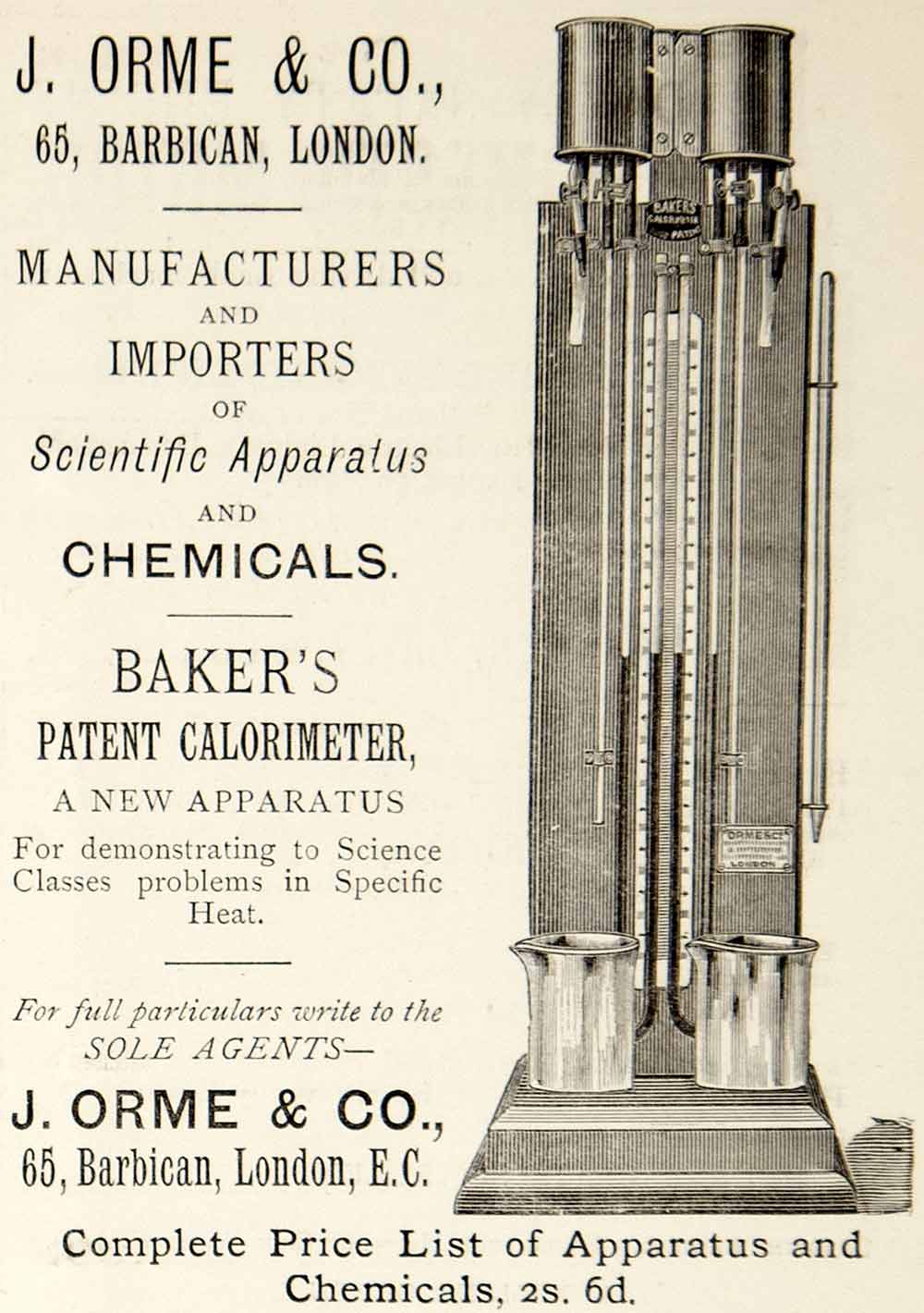 This is an original 1885 black and white print ad for Baker's patent calorimeters that were sold by J. Orme & Co., of 65 Barbican, London, England during the Victorian era.