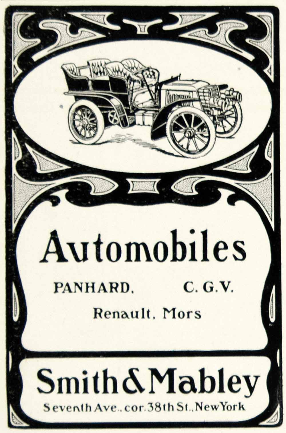 This is an original 1903 black and white print ad for automobiles that were made and sold by Smith & Mabley of Seventh Avenue and 38th Street, New York, NY.